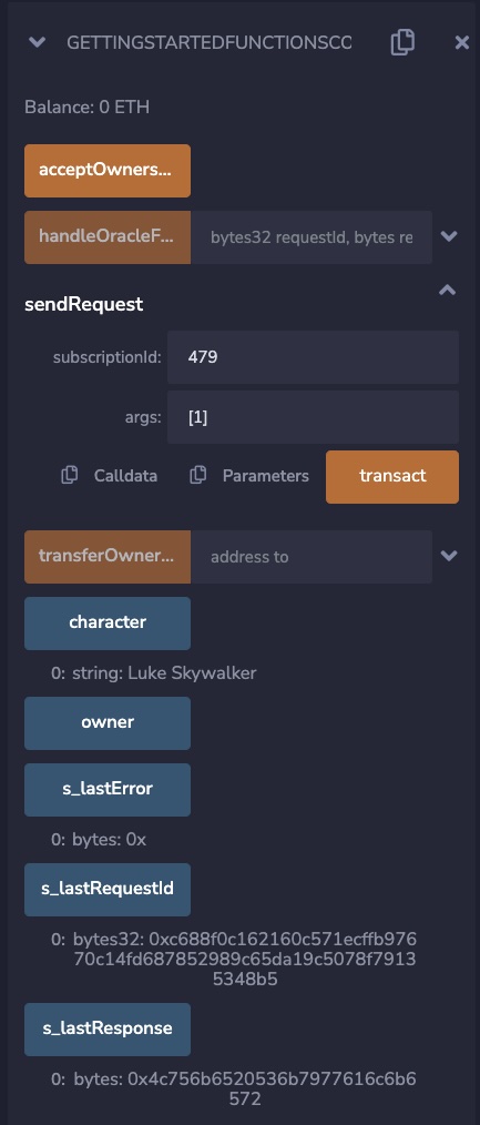 • fulfillRequest to be invoked during the callback. This function is defined in FunctionsClient as virtual (read fulfillRequest API reference). So, your smart contract must override the function to implement the callback. The implementation of the callback is straightforward: the contract stores the latest response and error in s_lastResponse and s_lastError, parses the response from bytes to string to fetch the character name before emitting the Response event.
